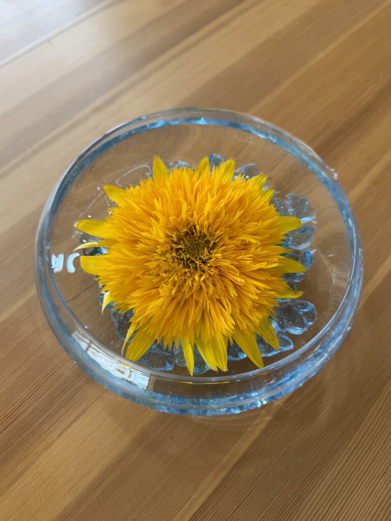 雅のひまわり 2025.08.28 このひまわりは初めて!!見慣れないからか、すごく綺麗!! そして、色が元気をくれるような鮮やかな黄色(*^^*) 事務所内でも見ていたく、一本切って花瓶に浮かべました(*^^*) いかがですか? 新聞紙のドーム! ライト