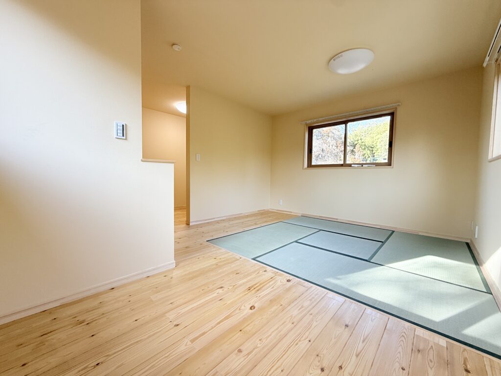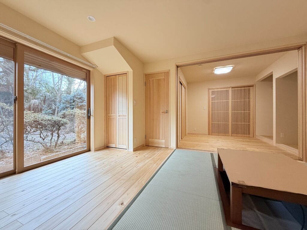 掘りコタツのあるリビングと隣の部屋は、必要に応じて間仕切りができる間取りに♪