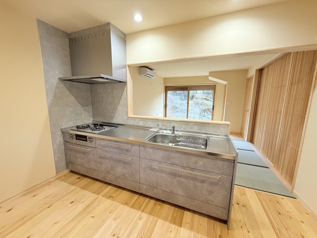 お庭の方に向けて対面キッチンがあるため、日中もキッチンに立ちながら景色が楽しめます😊