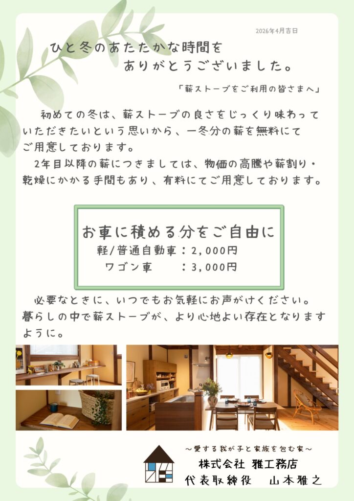 雅工務店では、薪ストーブを設置してくださったお客様へ、お気持ち薪の提供をさせていただいております。物価高騰の中、薪ストーブでエコに楽しんでいただきたく、薪の提供内容を変更いたしました。