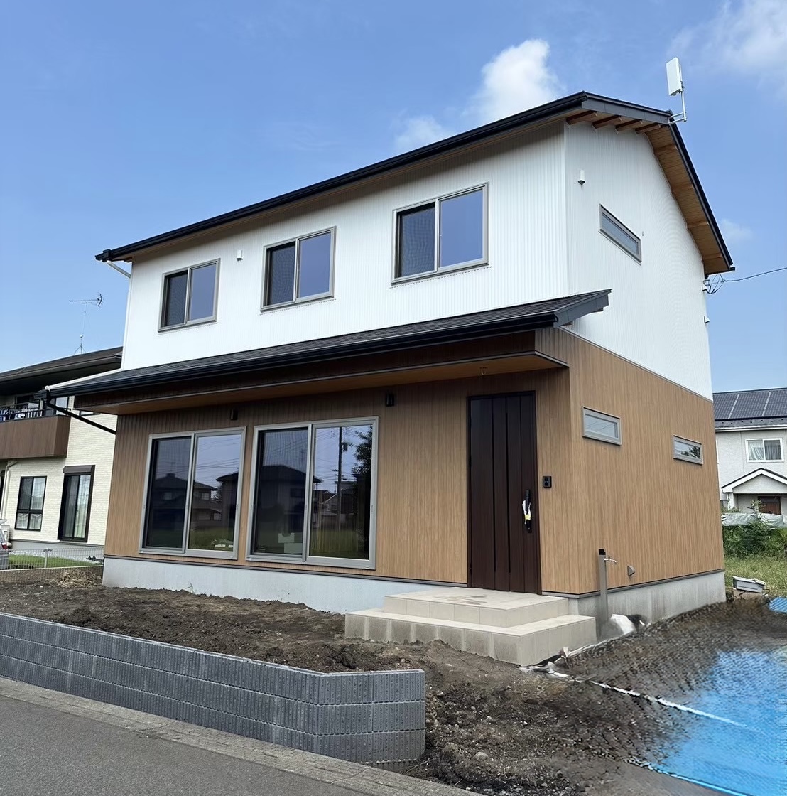 外観は、木色と白の外壁で自然とも馴染む造りに。